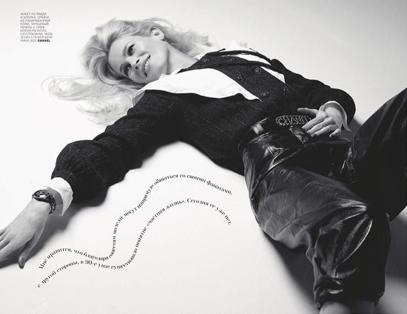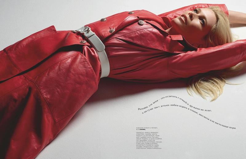 克劳迪娅·希弗 (Claudia Schiffer ) 在《 Vogue》俄罗斯版的封面中脱颖而出。被Cuneyt Akeroglu 抓获瞬间,她身穿猩红色 Chanel 夹克、金色腰带和黑色长裤。在时尚亮片中,克劳迪娅拥抱了一个装满法国品牌的衣橱。这位金发超模由Katerina Zolototrubova 设计,展示了她标志性的容貌。